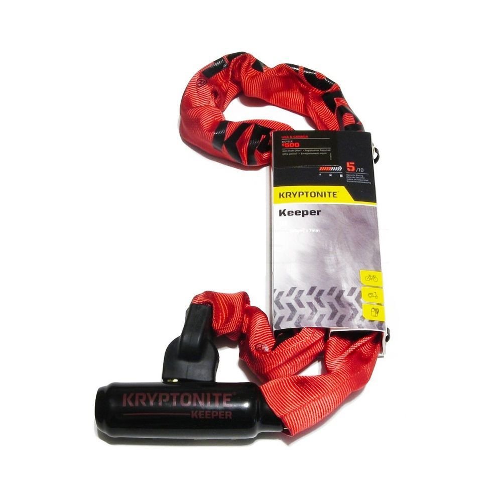 Las cadenas Kryptonite Keeper ofrecen un balance entre flexibilidad y seguridad, es una cadena de eslabones de 7mm de cuatro lados de acero al manganeso 3t, su cerrojo endurecido proporciona mayor seguridad y su cilindro de estilo disco es resistente al uso de taladros y su manga de nylon protege tu bicicleta de rayones. Incluye 2 llaves ergonómicas.
